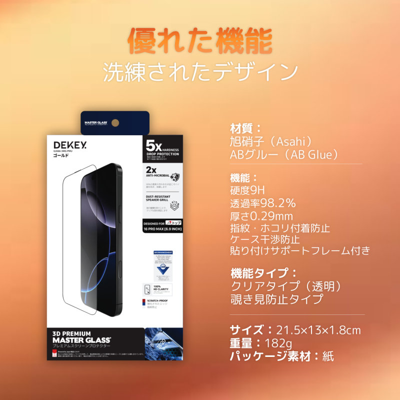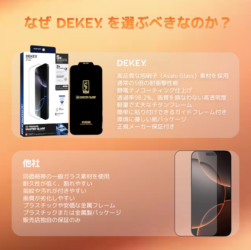 DEKEY iPhone 16シリーズ用スクリーンプロテクター 3Dマスターガラスプレミアム、10H硬度 ― 全面保護クリア、5倍の耐衝撃性、耐傷性および耐油性表面(アップグレード版